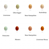 Le razze di galline ovaiole allevate nella tenuta dell’azienda agricola sono Australorp, Araucana, Olive Egger, Marans, New Hampshire, Livornese bianca e Livornese rossa. La gallina Australorp proviene dall’ Australia. Le uova sono di un bel colore marrone chiaro. L’Araucana è originaria delle Ande cilene. Le uova sono di una colorazione verde acqua tenue tendente al celeste. La gallina di razza Olive Egger, ibrida tra una Marans e una Araucana, depone uova dal colore “verde oliva” in varie tonalità. La Marans è caratterizzata dal colore “brunastro” delle sue uova. La New Hampshire è di razza statunitense, le sue uova sono di colore rossiccio. La Livornese, sia bianca dalle uova bianche, che rossa, dalle uova rosse, è originaria della campagna toscana.